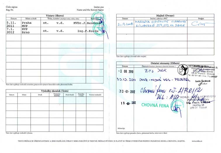 chovná fena FCR narozena 2.8.2008 po otci O'Flanagan Vice Versa z matky Iris z Kroukartí po Black Amandas Jolly Good Fellow DKK: 0/0 (A/A) OVVR prospěla, 2. místo, nos, voda hodnocení 4 výstavy: 2x VD